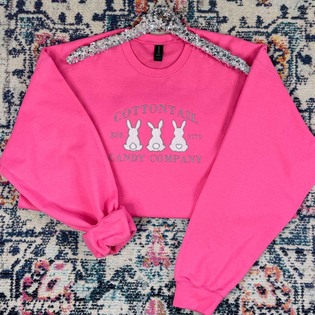 The cutest embroidered sweatshirt - perfect for Easter! Multicolor stitching on a bright pink Gildan crew.