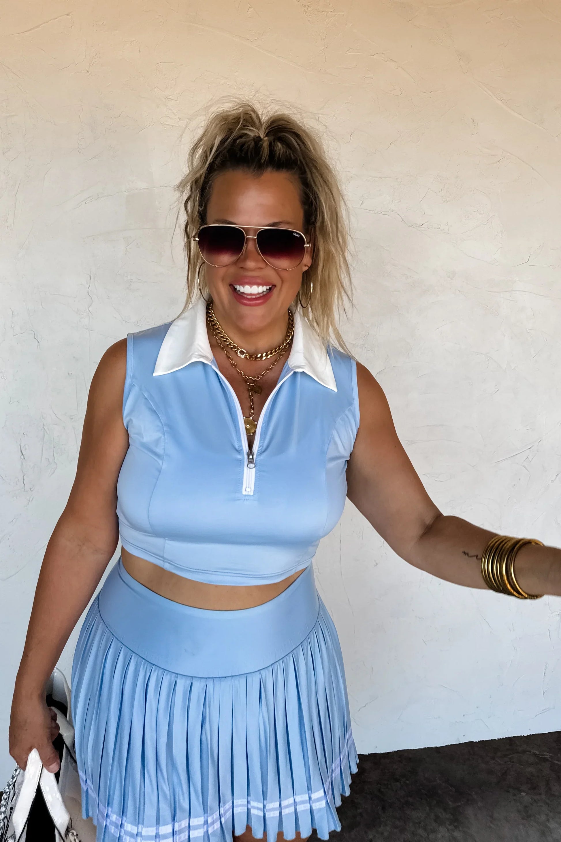 This cropped half zip-up tank is serving all the sporty vibes with a flirty twist. It features a sleek silhouette with contrast piping and a bold color collar, perfect for pairing with our tennis skorts, shorts, or joggers. Whether you’re on the move or just dressing like it, this tank is ready to ace your fit every time.