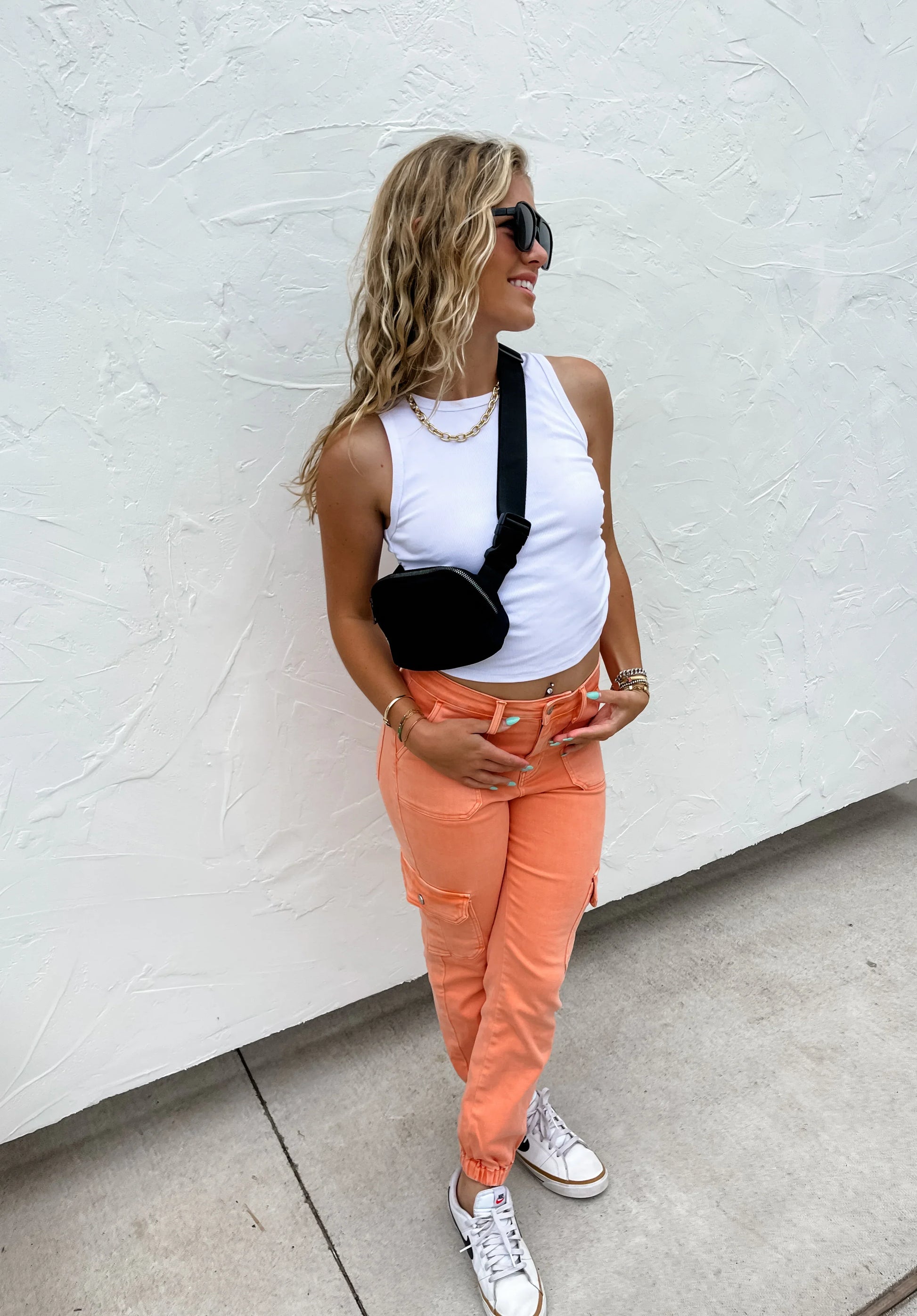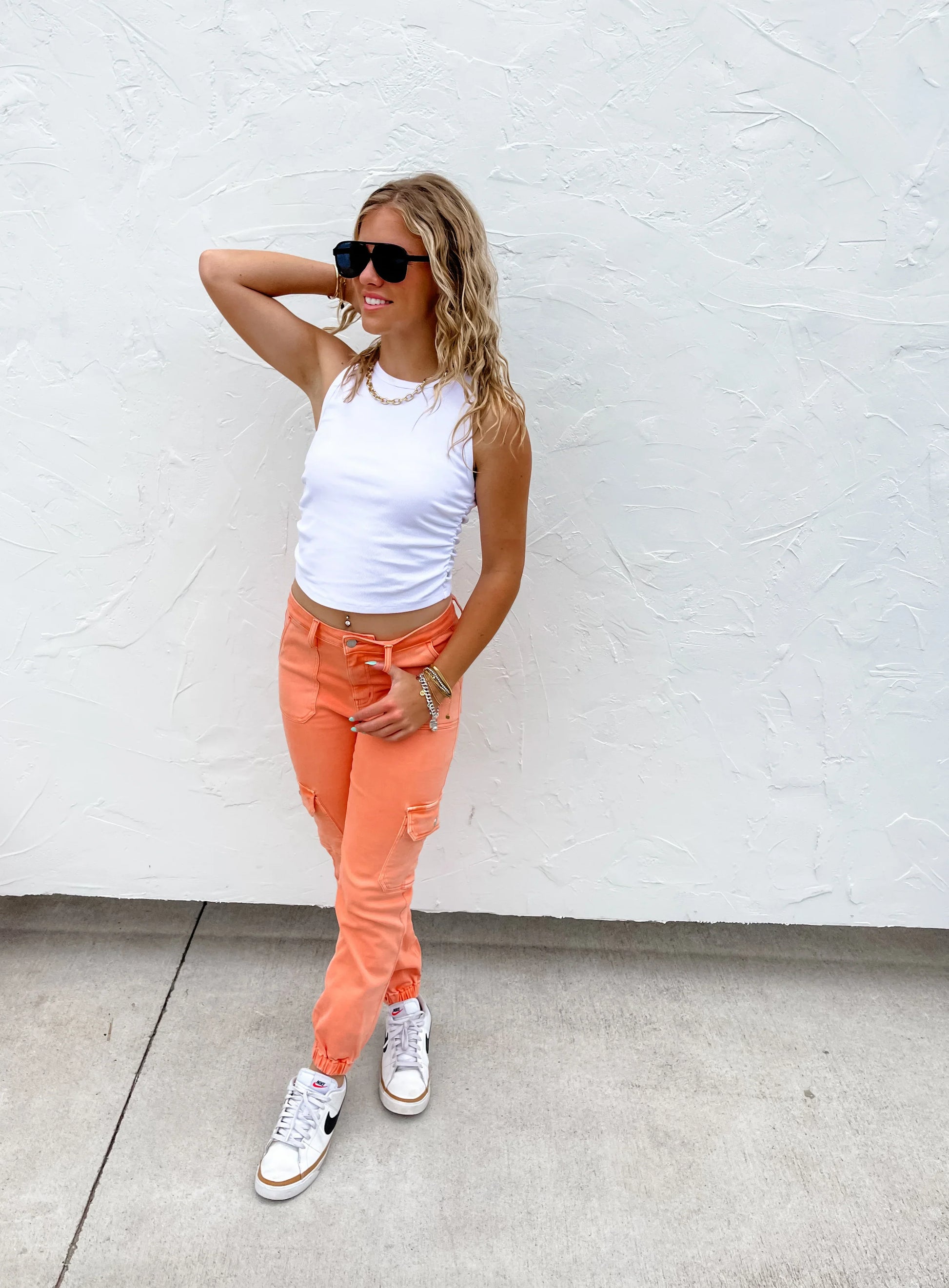 Elevate your casual style with these cargo joggers! The ultimate blend of fashion and function, with spacious pockets and a trendy cargo design. Available in coral and olive, these joggers offer both comfort and style for any occasion.