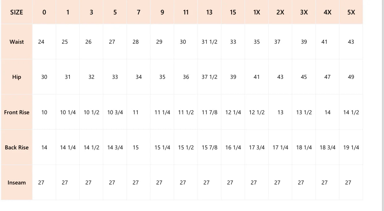 - INSEAM: 26"/Size 5 - 27"/Size 1X
