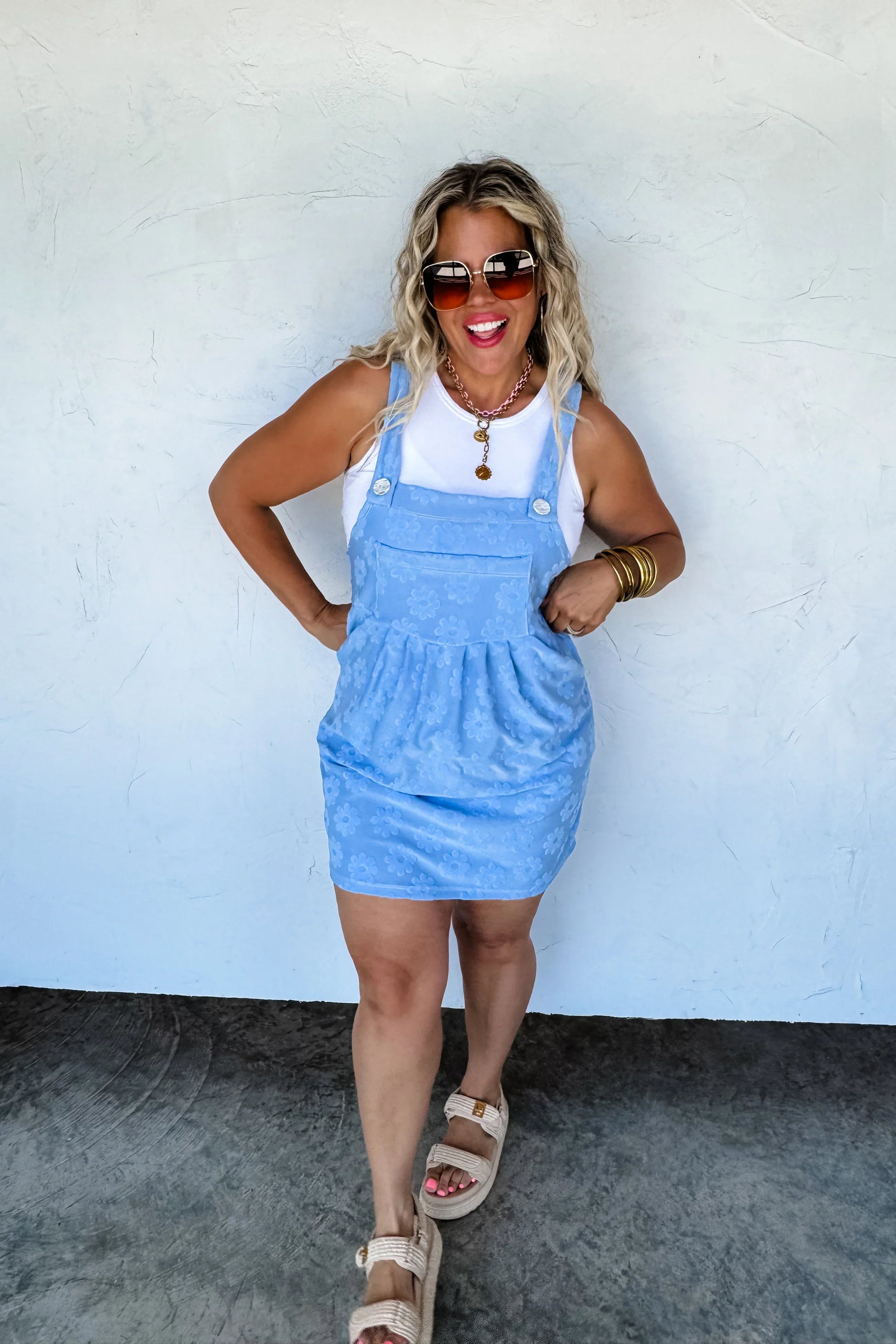 Our most popular style overalls got a makeover and now is in a SKIRT! Features our best selling “daisy” fabric! Laid-back Spring inspired raised terry floral pattern on a soft stretchy fabric! Perfect for warmer weather. Details include oversized side pockets with front pleating and an adjustable button strap for a perfect length (fasten the button up or down to adjust length) complete with a stylish front bib pocket.